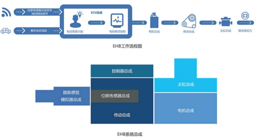 线控制动目前的主流方案是EHB(Electro-hydraulic Brake),远期将向EMB(Electro-Mechanical Brake)发展。EHB以传统的液压制动系统为基础,用电子器件取代了一部分机械部件的功能,通过电机转化为强大的直线推力,推动制动主缸推杆,是半电子化的方式。