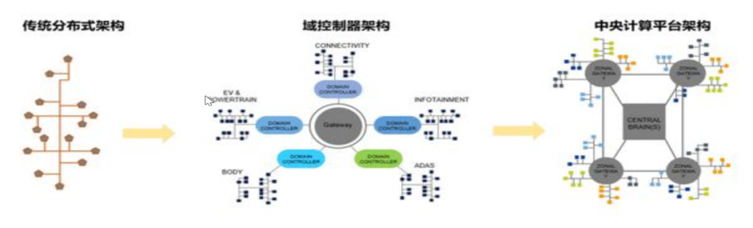 在此背景下,博世、大陆、德尔福等Tier1厂商提出域控制器(DCU,Domain Control Unit)概念,通过利用处理能力更强的多核CPU/GPU芯片,使得DCU可以相对集中地控制每个域,从而取代传统的分布式电子电气架构。减少ECU的数量,系统管理会更容易,平台的可扩展性会更好。电子电气架构开始从传统分布式架构向集中式域控制器架构转变,再向未来的车载中央计算平台架构发展。