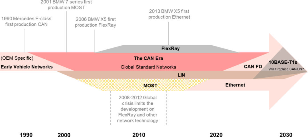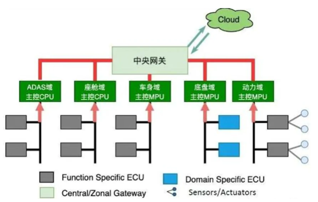 传统的汽车电子电气架构(EEA,Electrical/Electronic Architecture)是分布式,每个ECU 都是通过 CAN 总线或LIN总线连接,逻辑控制复杂,ECU难以统一维护,无法适应快速迭代。ECU来自不同供应商,有不同的嵌入式软件和底层代码,造成了相当大的冗余,共性部分无法复用。