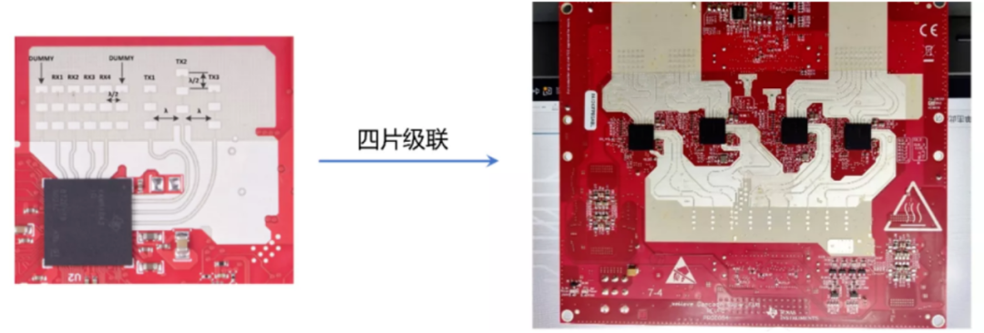 级联方案就是将多个芯片模块级联,目前是主流趋势。2019年TI推出级联方案,通过将四个3发4收的单个MIMO芯片级联,可以构成12发16收的MIMO雷达阵列,雷达系统的虚拟通道数从12提升到了192,极大的提升了雷达系统的角度分辨率。