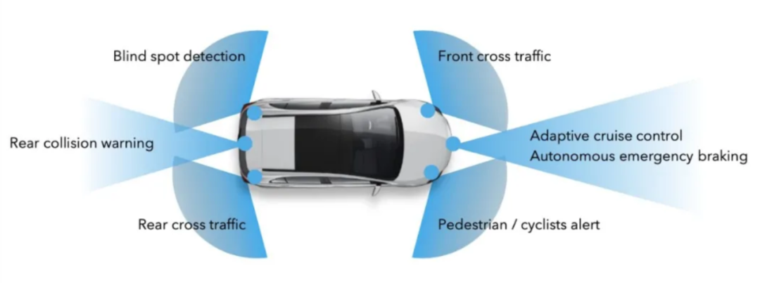 毫米波雷达是工作在毫米波波段探测的雷达,穿透雾、烟、灰尘的能力强,具有全天候、全天时的特点。车载毫米波雷达是新能源智能汽车ADAS系统感知层的重要组成部分,按照测量距离划分,有短距的SRR,中距的MRR,长距的LRR。前向雷达采用77GHz或79GHz的频段,探测距离比较远,属于LRR,实现自主紧急制动(AEB)和自适应巡航控制(ACC)功能。角雷达采用24GHz的频段,属于SRR,实现盲区检测(BSD)、变道辅助(LCA)、交通警报(F/RCTA)等功能。