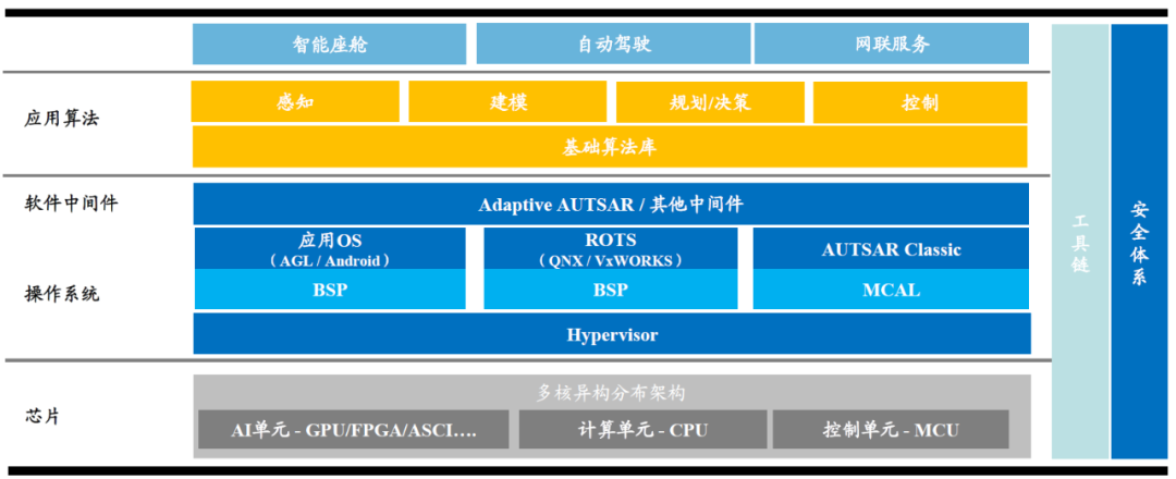 智驾域(ADAS)控制器主要由硬件和软件构成,硬件包括PCB板卡、各种芯片CPU/GPU/MCU,以及各种电子元器件,软件包括虚拟化Hypervisor、底层基础软件BSP、实时操作系统ROTS、基于AUTSAR的中间件Middle Ware、上层应用算法等构成。