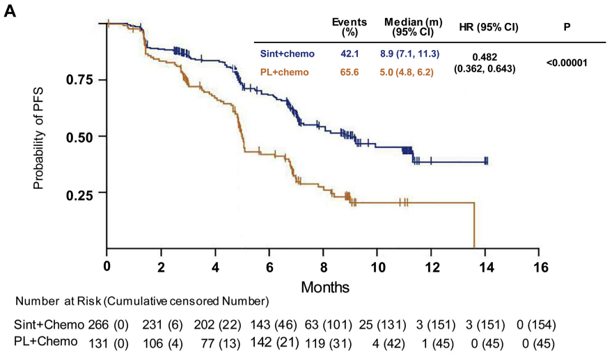 根据ORIENT-1试验结果,达伯舒联合化疗组的中位无进展生存时间(简称中位PFS)为8.9个月,而对照组仅为5个月,疾病进展的风险下降了52%。依靠ORIENT-1的优异数据,达伯舒已经顺利获得了中国药监局的非鳞状NSCLC适应症批准。