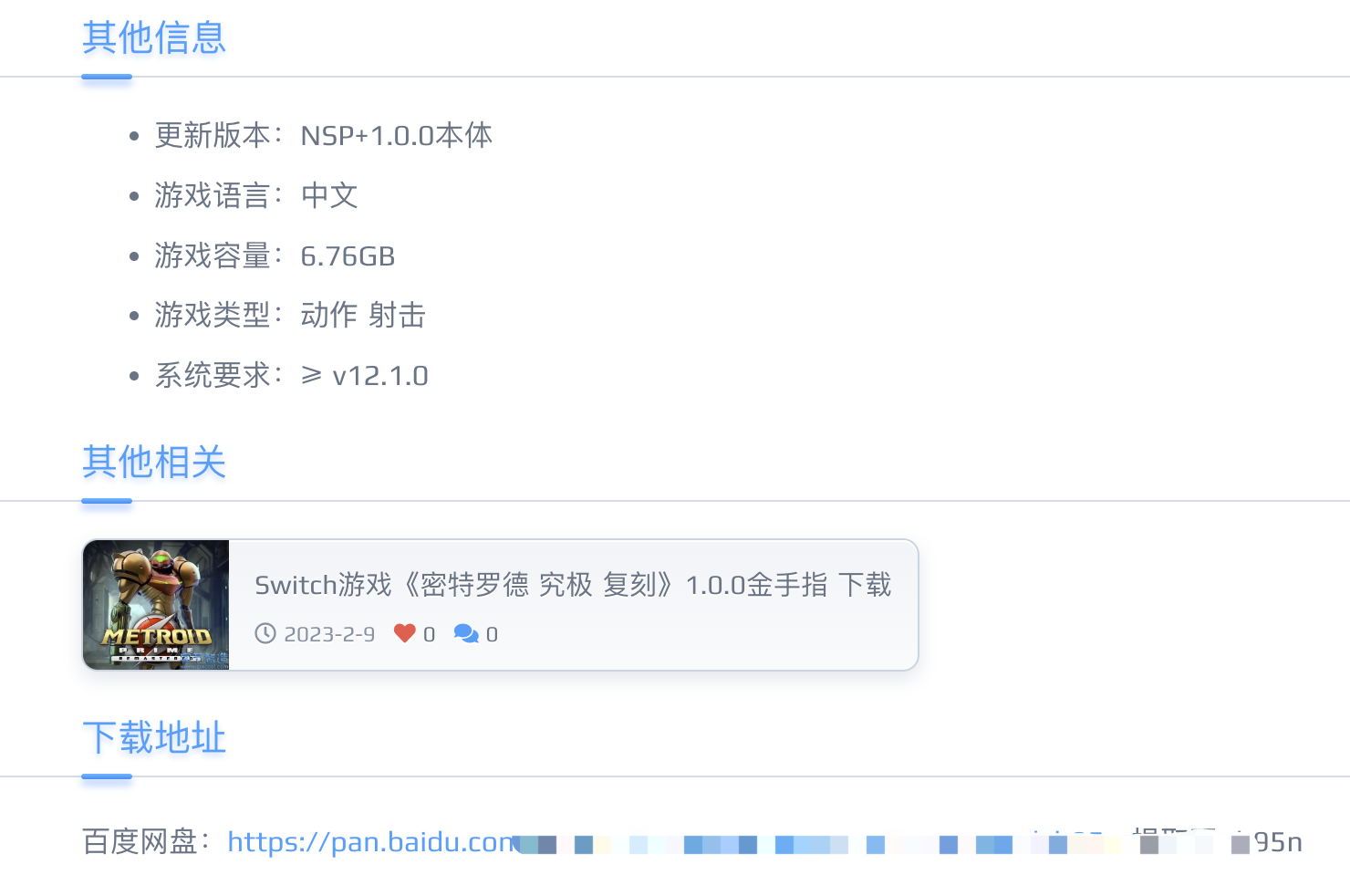 《密特罗德 究极 复刻版》港版卡带开卖的时间是2月24日,但电子版要提前很多,2月9日就能购买并下载游玩了。目前互联网上流传的这款游戏的文件,基本都是NSP格式的,可以视作是它的镜像文件,体积约为7GB左右。《密特罗德 究极 复刻版》的NSP文件在各类资源网站上流传,一般用户可以轻而易举地下载下来。