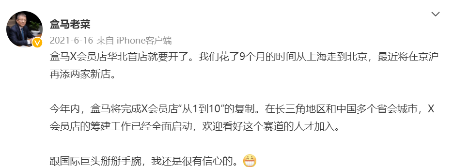 “今年内(指2021年),盒马将完成X会员店‘从1到10’的复制,跟国际巨头掰掰手腕,我还是很有信心的。”