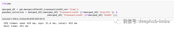 我们可以通过联接项目列以及联接条件(TransactionDt≥StartDt和TransactionDt≤EndDt)来实现这一点。因为现在我们的连接条件也有大于号和小于号,这样的连接称为不等连接。在继续之前,一定要考虑如何在pandas中做这样的事情。