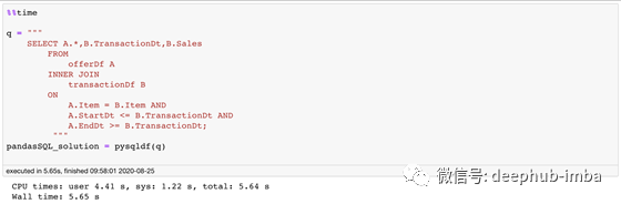 当我们用可读性更强的PandaSQL为pandas计时时,我们发现PandaSQL花费的时间大约是原生pandas的10倍。