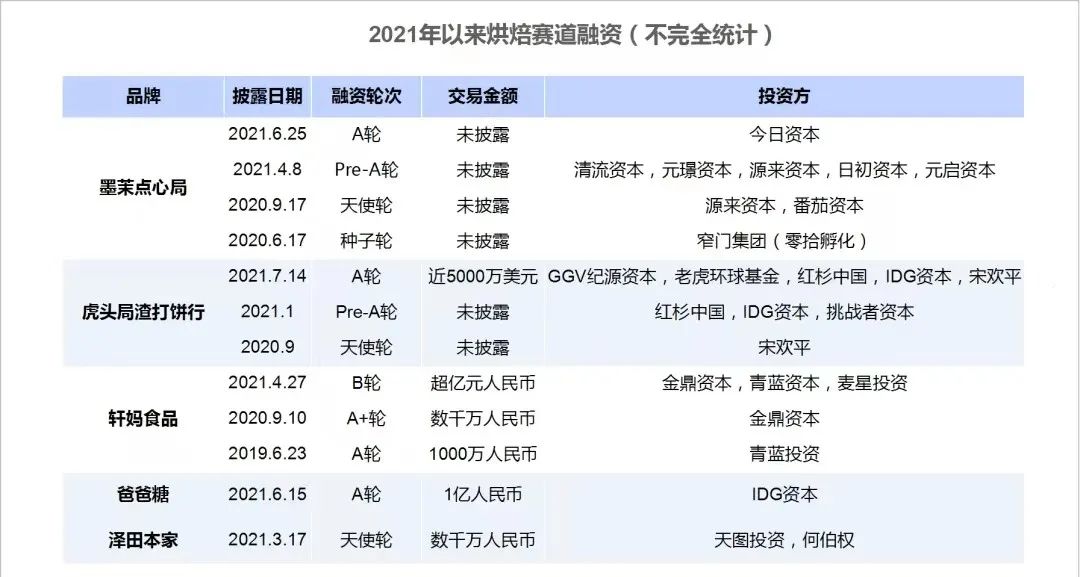 为了抢占先机,资本更是排着队送钱。2020年6月成立的墨茉点心局,在成立不过一年时间里,一口气拿到了五轮融资,频率之高,让人瞠目。