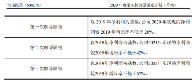根据恒瑞医药公告,2020年推行的股权激励计划以2019年业绩为基数,并要求2020-2022年每年净利润均保持约20%的增速方能解除限售。对于恒瑞医药这个大牛股而言,20%的年化复合增长率并不高,此前三年恒瑞医药净利润的平均增速在27%左右,似乎只要管理层保持常态就能轻松获得这项激励。