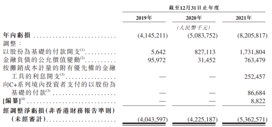 与所有造车新势力一样,在没有达到足够多的产能及销量之前,威马的年亏损逐年增加。2019年至2021年,累计亏损接近175亿元。其中,2021年威马净亏损82.06亿元,调整后净亏损为53.63亿元。