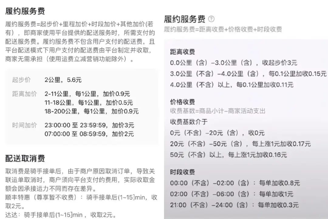 图说:左图为抖音外卖履约服务费机制,右图为美团外卖履约服务费机制