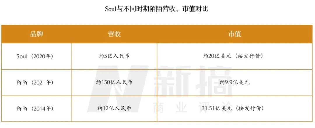 与之对比,陌陌尽管营收高达150亿RMB,但最新市值仅9.9亿美元。遥想当年,陌陌在2014年上市前夕营收12亿人民币,市值已超过31亿美元。