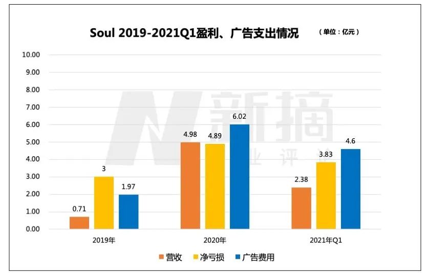 但是,拨开Soul业务高增速的面纱,仍有两点让外界担忧。一是持续拉大的亏损。不仅如此,亏损扩大的比例还高于Soul的营收增速:以2021年一季度营收同比增长260%,亏损则同比扩大624.7%。二是营销支出维持高企状态。2021年一季度,Soul的广告费同比增长784.62%。