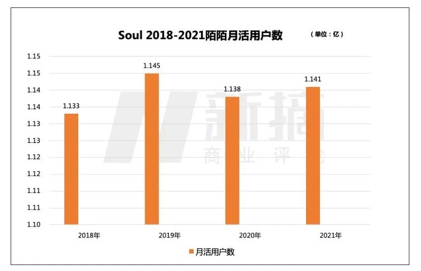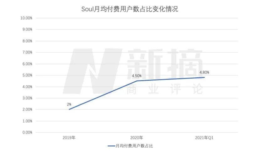 Soul已经增加了开屏广告等形式,但从营收占比上看,Soul广告业务占比偏低。2021年一季度,Soul APP平均月活跃用户数为3320万,(与之对比陌陌月活已过亿),这一量级对广告主吸引力仍显不足。
