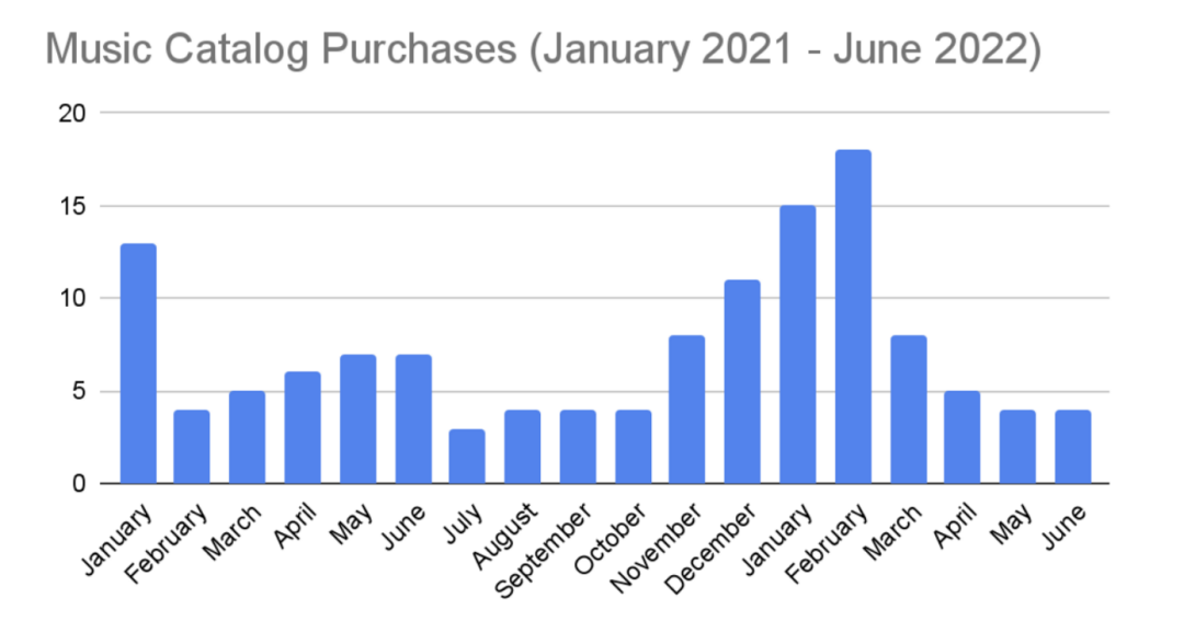 就在人们预测2022年还将创新高时,市场却开始冷静下来,并且时间刚好和美联储加息的时间一致,都是在3月。去年4月,彭博社发文,认为随着利率上升和通货膨胀,音乐版权热或许已经到头。