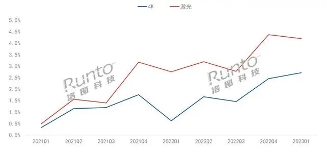 低端投影仪占领市场,并不妨碍忠实消费者追求更高质的高端产品。2023年第一季度,4K智能投影线上市场份额上涨至2.7%,去年同期才0.6个百分点;激光光源产品的线上销量占比达到4.2%,较去年同期上涨1.4个百分点。
