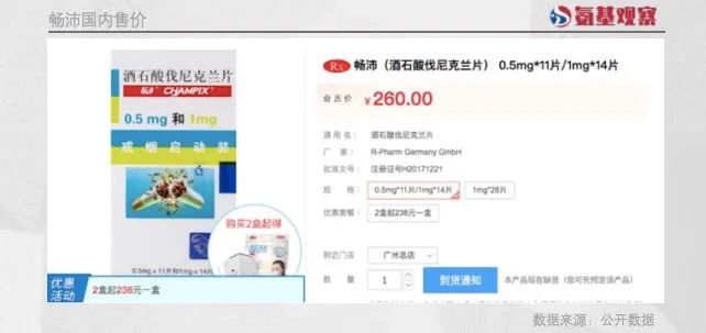 以国内为例。如下图所示,Champix0.5毫克11片/1毫克14片的产品组合为260元,1毫克*28片的产品为345元/盒。