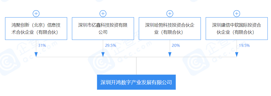根据企查查,深开鸿作为一家聚焦于开源鸿蒙二次开发的科技企业,深开鸿股东中包括深圳哈博科技投资合伙企业,是华为旗下的投资基金,股权为20%。而另一股东为深圳建信中软国际投资合伙企业,股权穿透同样为中软国际,皆与华为有着千丝万缕的联系。
