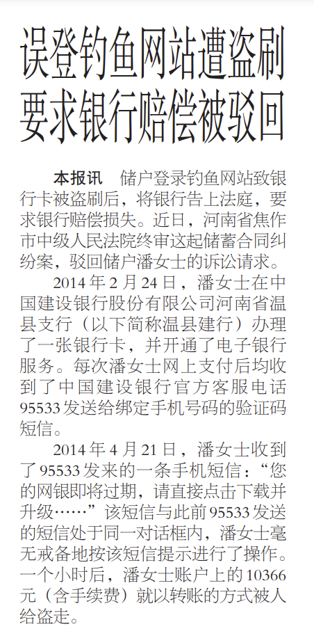 《人民法院报》曾报道过一则案例,潘女士收到955XX发来的短信:“您的网银即将过期,请直接点击下载并升级……”潘女士按提示点击短信内链并按照提示操作后,账户上的10366元被转账盗走。潘女士之所以会进行那一系列操作,最关键的是该短信和之前955XX发送过的官方短信处于同一对话框内。