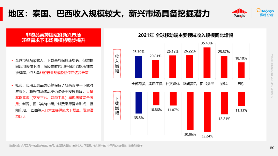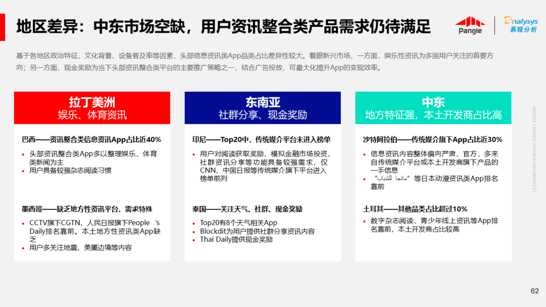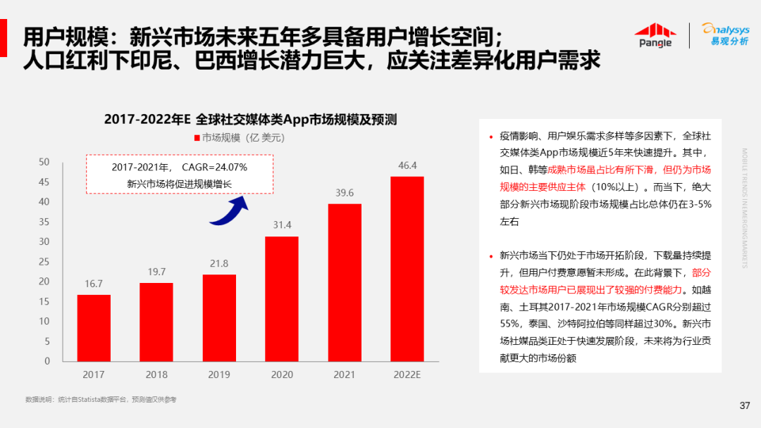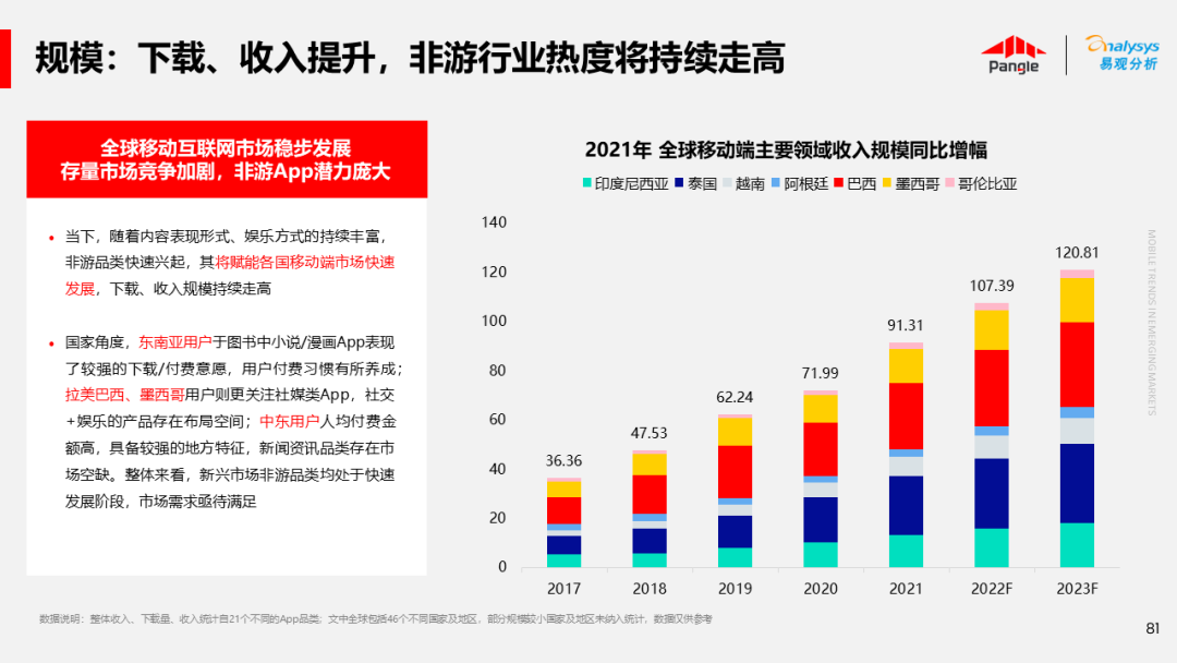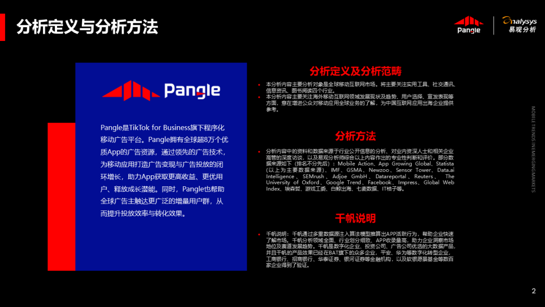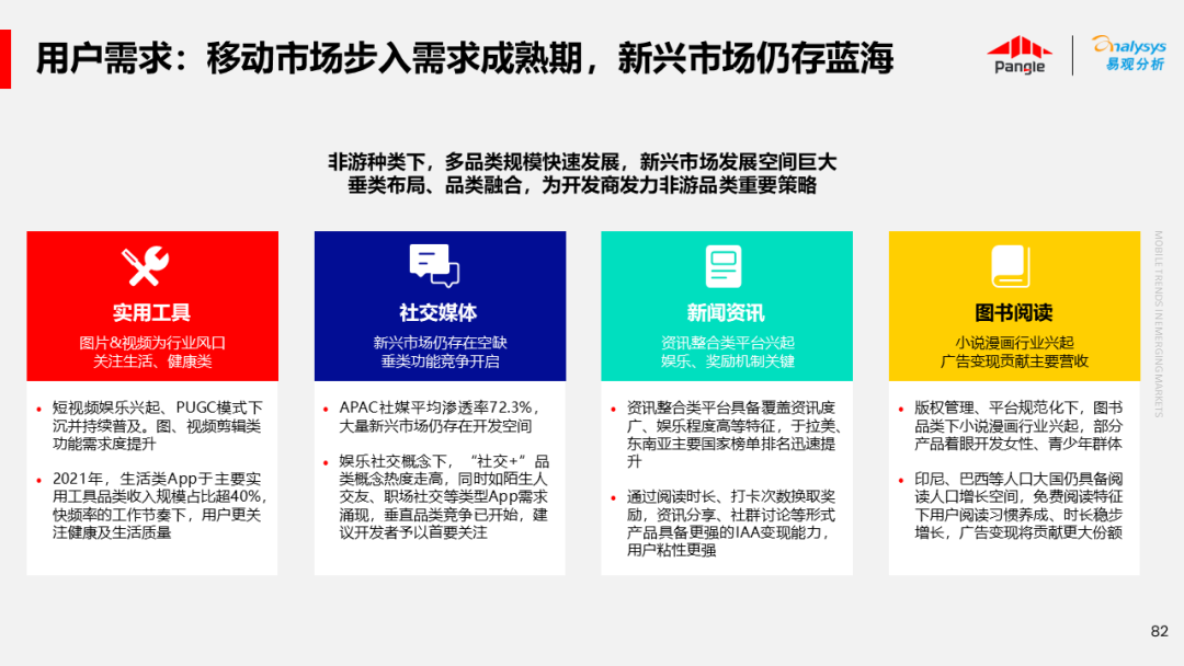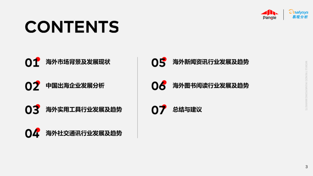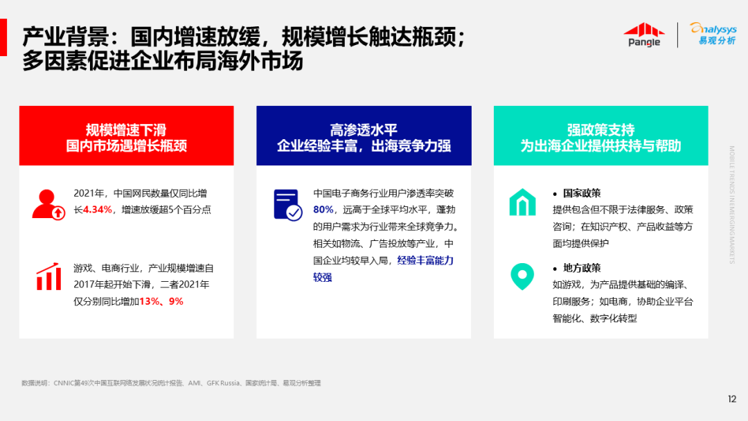 海外新兴市场快速发展,出海已成为中资企业发展的核心策略之一。易观分析联合Pangle共同发布的《全球新兴市场移动应用报告》关注全球非游移动互联网市场。从实用工具、社交通讯、信息资讯、图书阅读四大行业出发,分析发展趋势、用户倾向等内容,为中资企业、本土开发者提供参考。