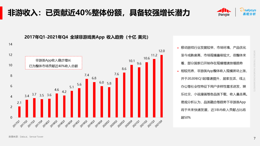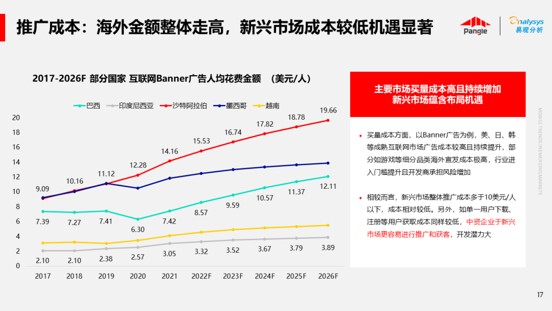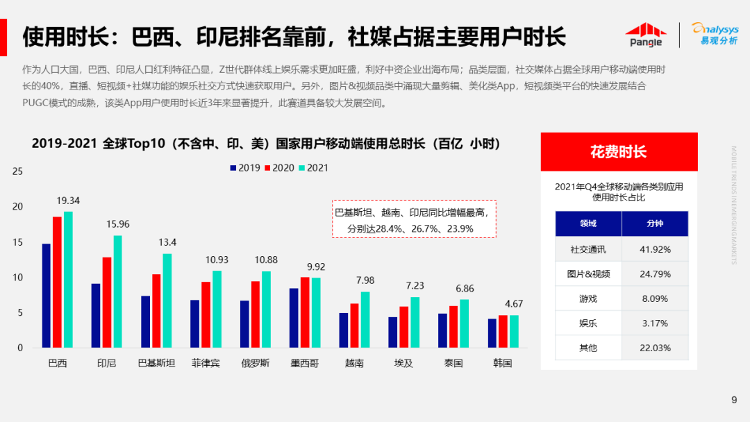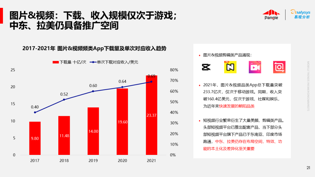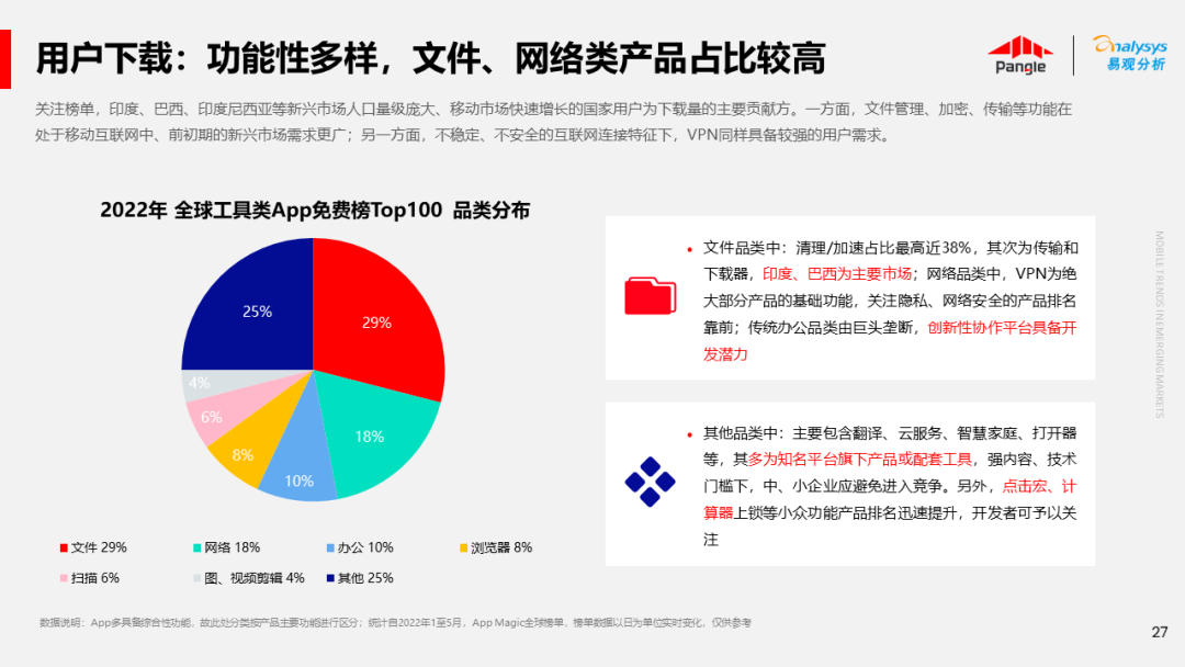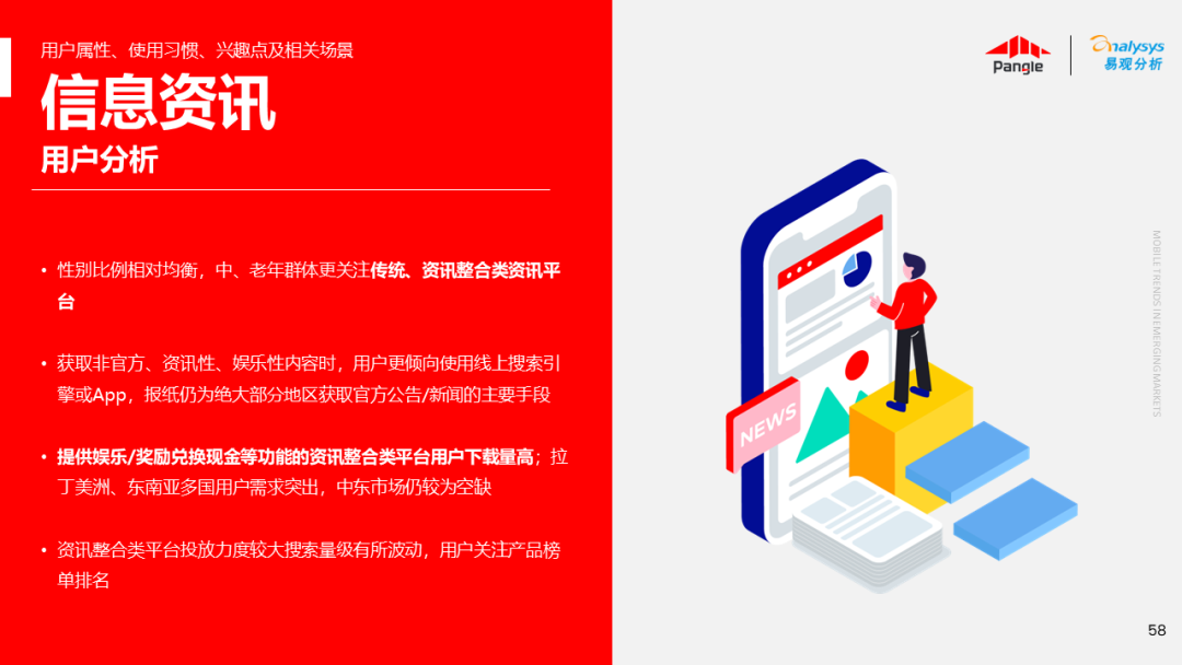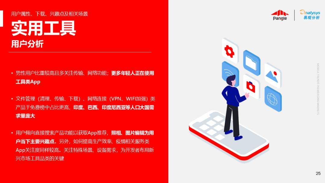 海外新兴市场快速发展,出海已成为中资企业发展的核心策略之一。易观分析联合Pangle共同发布的《全球新兴市场移动应用报告》关注全球非游移动互联网市场。从实用工具、社交通讯、信息资讯、图书阅读四大行业出发,分析发展趋势、用户倾向等内容,为中资企业、本土开发者提供参考。