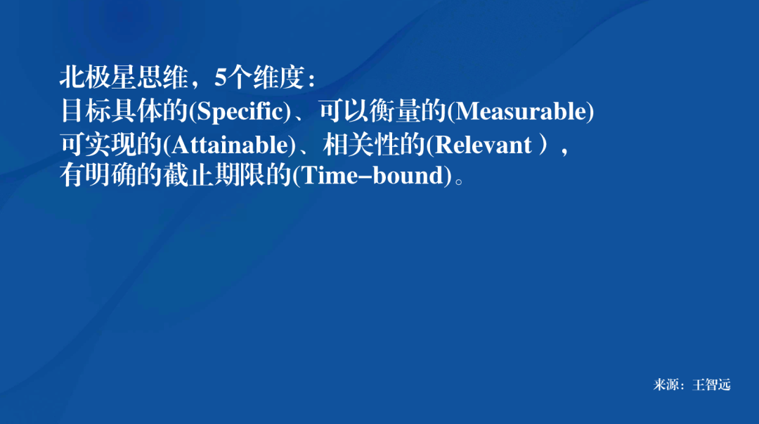 它有五个维度,分别为目标具体的(Specific),可以衡量的(Measurable),可实现的(Attainable),相关性的(Relevant),有明确的截止期限的(Time-bound)。