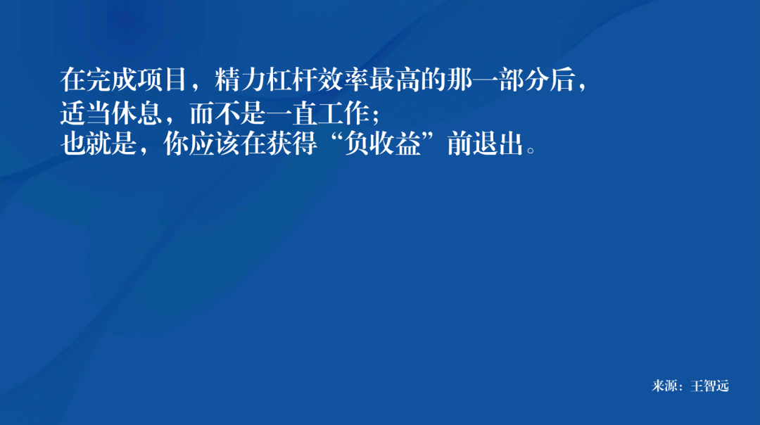 及时止损,在完成项目,精力杠杆效率最高的那一部分后,适当休息,而不是一直工作;也就是,你应该在获得“负收益”前退出。