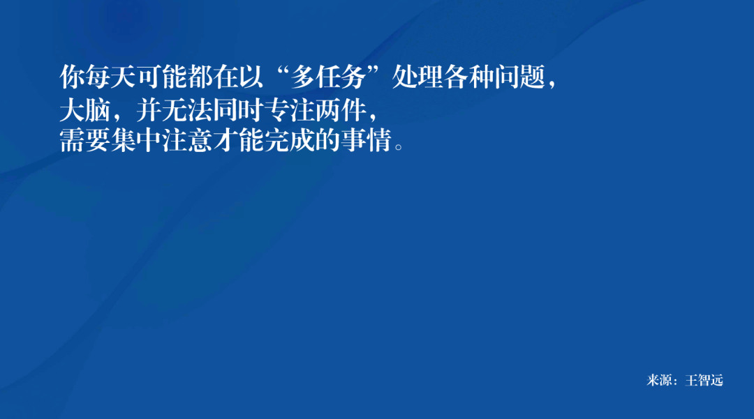 以前我说过,大脑有两种思考方式,一种感性下的自动导航模式,一种理性下的深思熟虑模式;你每天可能都在以“多任务”处理各种问题,大脑,并无法同时专注两件需要集中注意才能完成的事情。