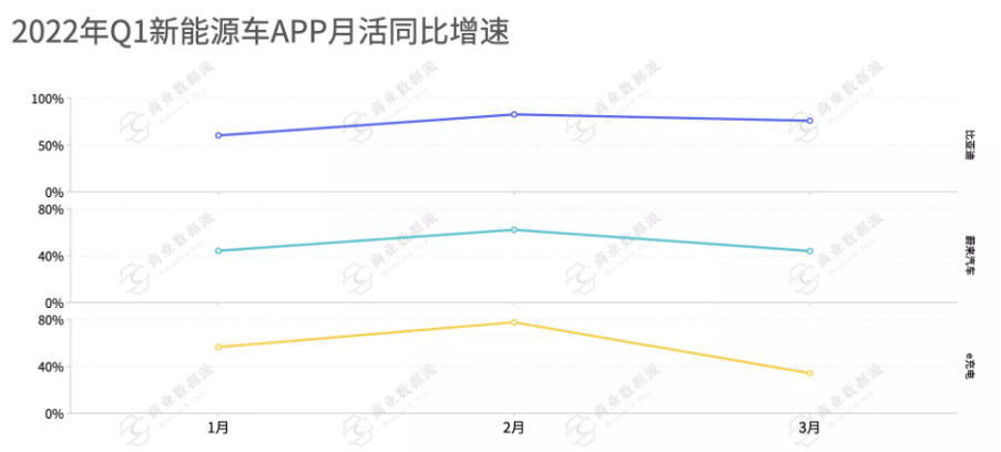 其中,比亚迪汽车APP在2022年第一季度,1~3月的月活同比增速分别达到了60.1%、82.6%、75.9%;蔚来汽车APP为44.1%、62.1%、43.9%;e充电为56.4%、77.5%、34.1%。