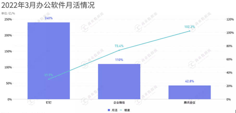 首先是协同办公领域,在CTR榜单上,钉钉和企业微信都进入了第一季度的APP季活前五十名。数据显示,3月,钉钉的月活超过了2.4亿,企业微信超过了1.1亿,腾讯会议超过了4278万,同比增速分别为29.9%、73.4%、102.3%。相比多数APP个位数或者负数的增长率,办公软件的增势相当可观。