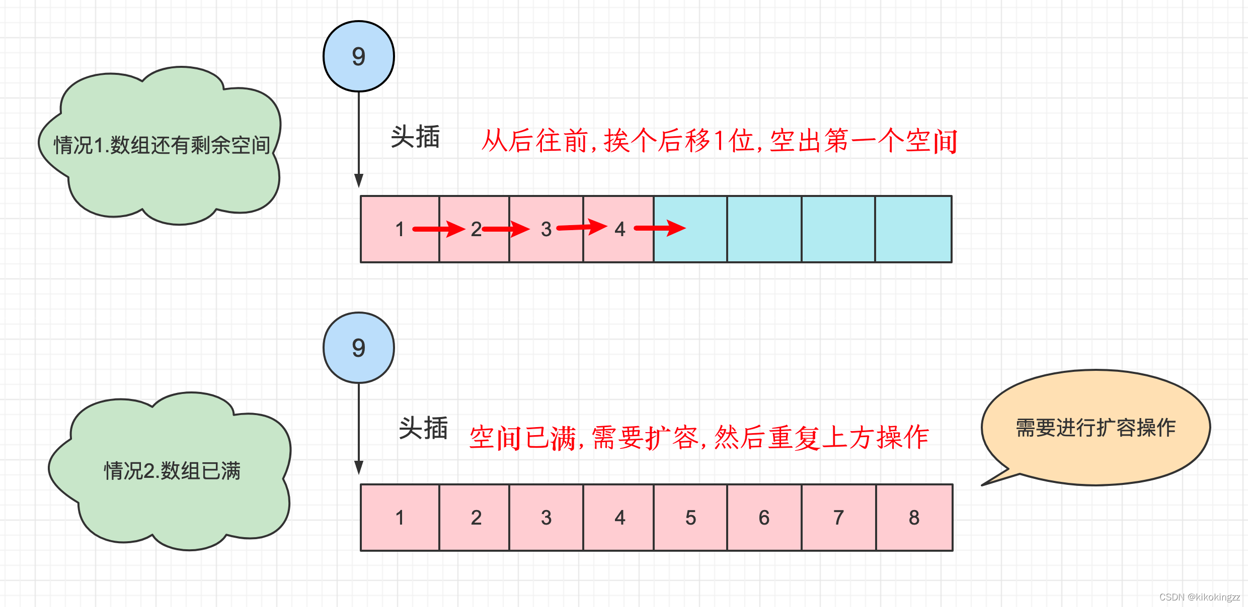 对于头插,我们发现依然会有两种情况:1.数组有剩余空间、2.数组已经满了,因此第一步仍然是进行判断数组空间是否已满,如果满了就执行扩容操作;然后按元素从后往前的顺序,依次将元素向后移动一位,将数组的第一个头空间空出来。