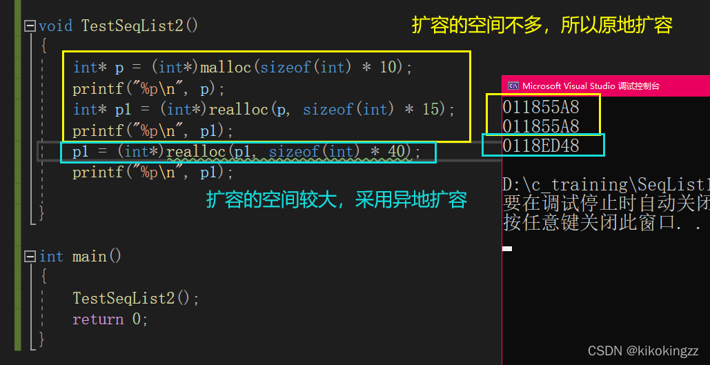 void SeqListCheckCapacity(SeqList* sl) { assert(sl);//声明sl,防止传入空指针 if (sl->size == sl->capacity)//如果相等,说明数组已满 { DataType newcapacity = sl->capacity == 0 ? 4 : sl->capacity * 2;//扩容 DataType* tmp = realloc(sl->a, sizeof(DataType) * newcapacity);//动态申请空间 if (tmp == NULL)//判断动态申请空间操作是否成功 { printf("realloc fail\n"); exit(-1); } else { sl->a = tmp;//将新申请的地址赋给动态数组指针 sl->capacity = newcapacity;//将新申请的空间赋予给capacity } } }Q1:初始化时未给动态数组分配空间,在这一步上是如何实现的?