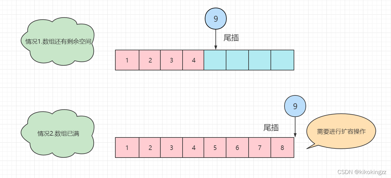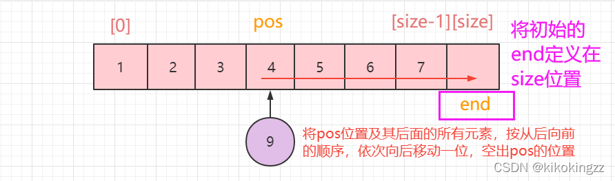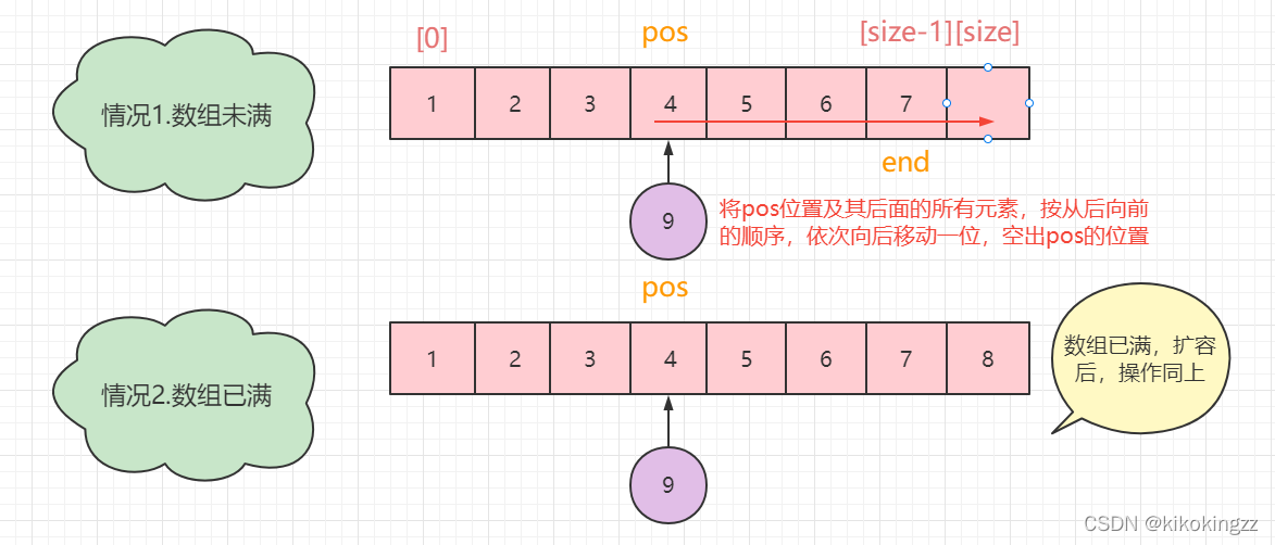 值得注意的是,在这里我们需要对pos的范围做一个规定,pos最前端可以达到数组的[0],此时相当于头插;pos最后端可以到达数组的 [size],此时相当于尾插。