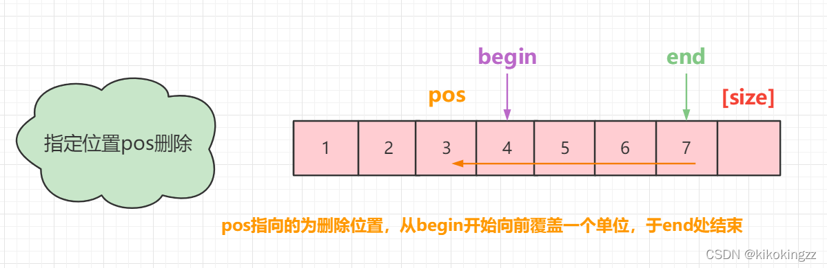 因此,在这里我们也需要对pos的范围做一个规定,pos最前端可以达到数组的[0],此时相当于头删;pos最后端可以到达数组的 [size-1],此时相当于尾删,为了方便我们可以采用无符号 size_t 来定义pos。