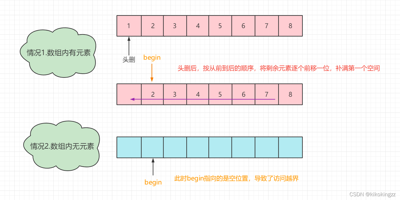 对于头删元素,我们需要与头插做对比。头删时我们需要将头部元素之后的所有元素,按从前到后的顺序,将这些元素逐个前移,这样第二个元素的值就会覆盖掉第一个元素的值,换句话说也就实现了头删的功能。