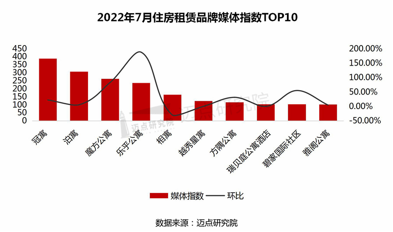从长租公寓品牌的媒体指数来看,7月,媒体指数排名前十的品牌依次是:冠寓、泊寓、魔方公寓、乐乎公寓、相寓、越秀星寓、方隅公寓、瑞贝庭公寓酒店、碧家国际社区、雅阁公寓。其中,媒体指数重点关注品牌为冠寓,其媒体指数达到388.97,排名位于媒体指数第1位。