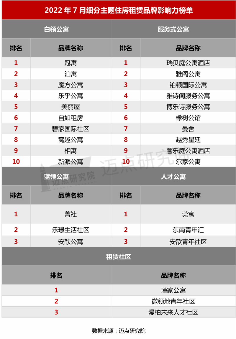 以下是迈点研究院独家发布的“2022年7月住房租赁品牌影响力(MBI)100强榜单”。本月冠寓 、泊寓、魔方公寓、乐乎公寓、美丽屋、自如租房、碧家国际社区、窝趣公寓、相寓、新派公寓进入榜单前十。