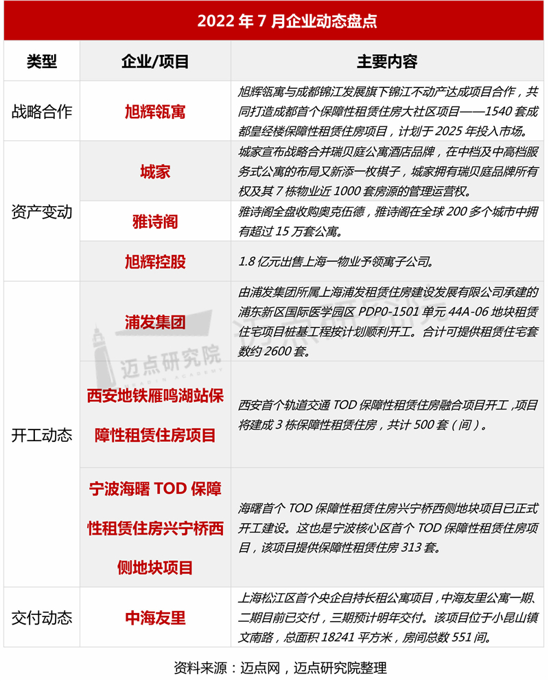 资产变动方面,收并购成为本月热点。包括城家宣布战略合并瑞贝庭公寓、雅诗阁全盘收购奥克伍德、以及瓴寓子公司购买上海旭辉纯真中心6号楼。资产交易为雅诗阁、城家公寓短期内带来大量的房源供应,且多数为服务式公寓。说明收并购日益成为企业战略扩张的重要渠道,且收益率较高的中高端产品更受资本市场的青睐。