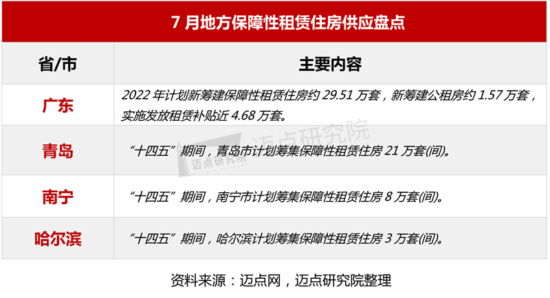 7月,广东、青岛、南宁、哈尔滨等市继续公布保障性租赁住房的供应计划。“十四五”期间,青岛预计筹集房源21万套、南宁力争供应总量达8万套,哈尔滨不少于3万套;广东2022年计划筹集保租房29.51万套。