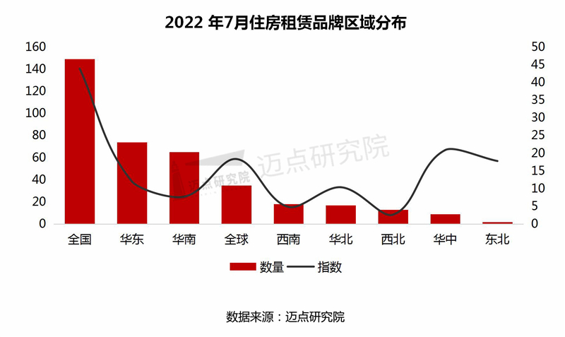 从住房租赁品牌分布地区来看,接近40%的品牌为全国性品牌。9%的品牌为全球性品牌。另外,华东、华南地区各自占比19%和17%。本月,华中地区的品牌表现最为出色,品牌指数上涨15.26%。其中雅诗阁服务公寓表现最为出色,排名攀升迅速,已连续7个月蝉联全球品牌排行榜的前五强。这主要与雅诗阁服务公寓的资本动作有关。7月4日,雅诗阁正式宣布从丰树产业私人有限公司(Mapletree Investments Pte Ltd.)手中全盘收购奥克伍德全球(Oakwood Worldwide)。成功收购后,雅诗阁全球的管理规模将进一步增加,将再增81家物业、约15,000套房源,获得了媒体的争相报道。