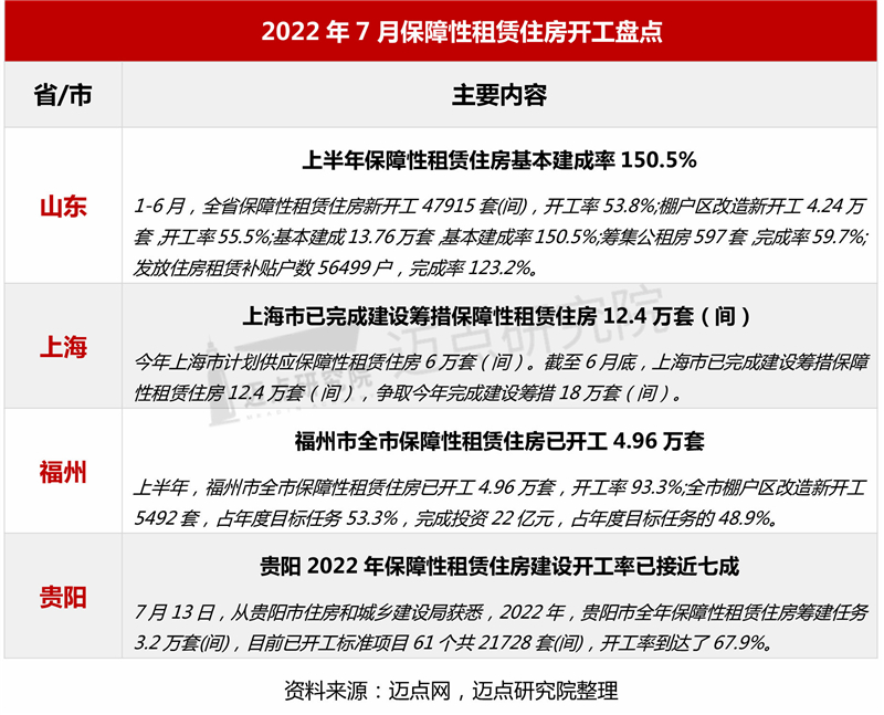 7月,山东、上海、福州、贵阳等省市发布保租房的半年度筹建进度盘点。其中,山东、贵州、福州开工率超过50%。上海已超额完成6万间的年度保租房供应计划。