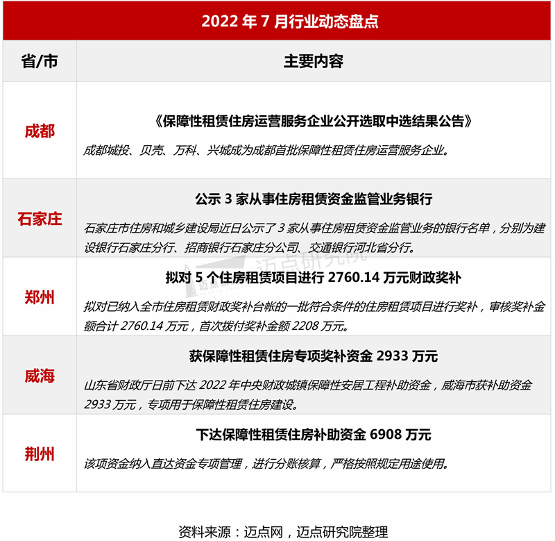 本月,地方政府在奖补方面动作较多。郑州、威海、荆州的住房租赁项目将获得中央财政专项奖补。其中荆州市财政局下达2022年中央财政城镇保障性安居工程保障性租赁住房补助资金6908万元,用于2022年保障性租赁住房建设。成都公布首批保障性租赁住房运营服务企业。有望推动保障性租赁住房的健康发展。