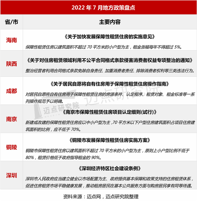 地方政府在市场监管方面加大政策力度,海南、陕西、成都、南京和铜陵加快推进保障性租赁住房的实施;市场培育方面,深圳发布条例,推动租房居民在基本公共服务方面与购房居民享受同等待遇。政策涉及保租房的租金标准规范、合同整治、保租房认定等。有利于促进住房租赁行业的规范化发展。