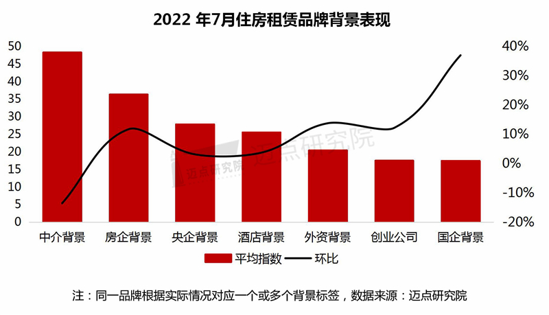 在长租公寓品牌的细分背景中,综合平均指数和增幅来看,本月国企背景品牌整体表现较佳,国企背景的品牌指数为17.46,环比上升37%。