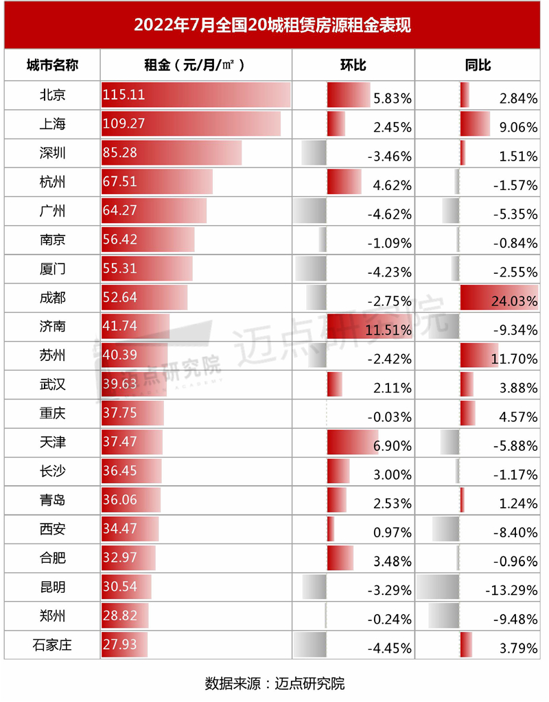 得益于疫情防控的稳定,7月,全国重点20城住房租赁市场继续回温,叠加毕业季的影响,租赁市场回归传统周期,市场活跃度大幅上升。全国20城租赁房源平均租金51.5元/月/㎡,环比上涨0.85%。北京、上海等城市均迎来租赁旺季。