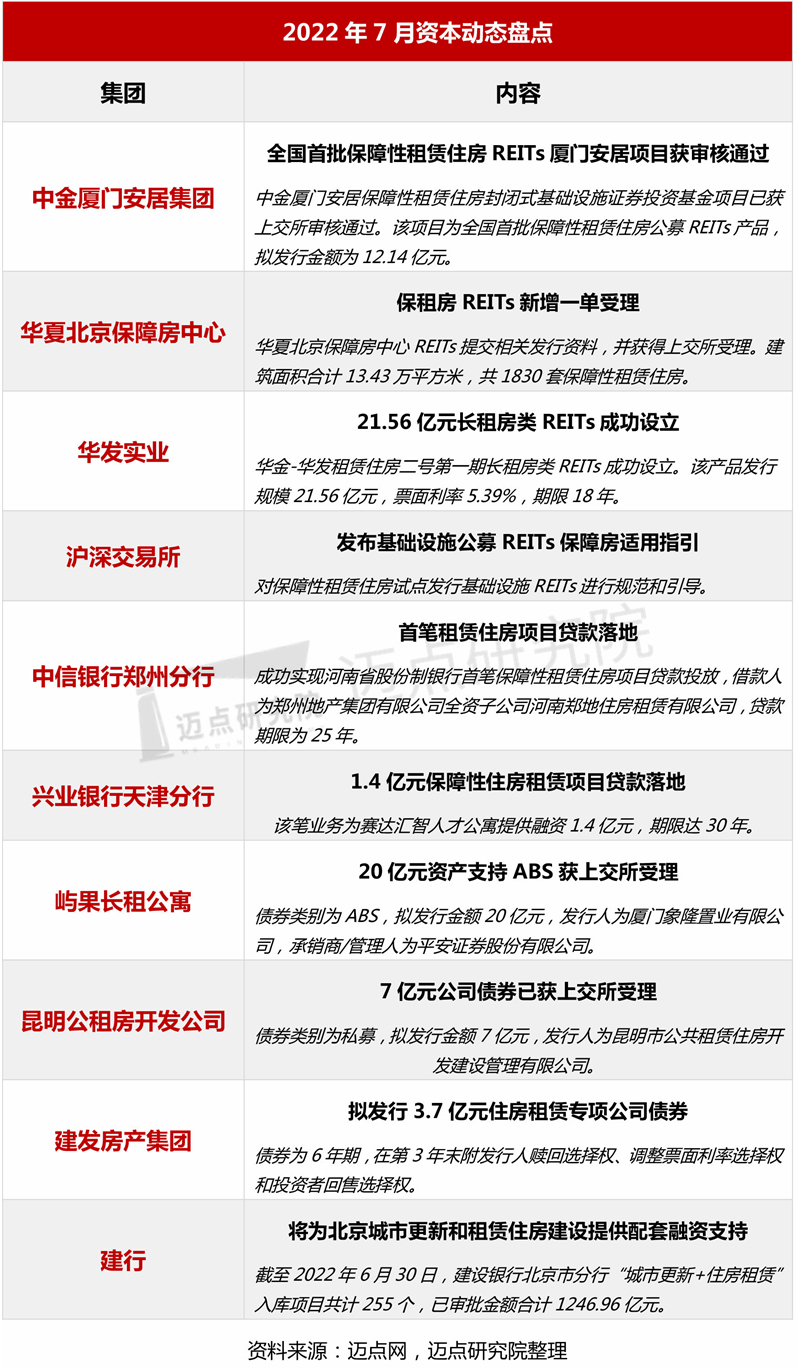 7月,保障性租赁住房REITs试点工作的加速落地。全国首批保障性租赁住房REITs厦门安居项目获审核通过、华发实业21.56亿元长租房类REITs成功设立、华夏北京保障房中心REITs获得上交所受理;另外,建行将为北京城市更新和租赁住房建设提供不低于1万亿元配套融资支持、屿果长租公寓、建发房产集团等也迎来融资新进展。可见,在政策的引导下,国内住房租赁融资市场回暖。尤其是沪深交易所《指引》的发布,将进一步推动保障性租赁住房REITs市场的平稳健康发展,建立多主体供给、多渠道保障、租购并举的住房制度。