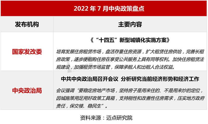 7月,中央进一步培育和发展住房租赁市场,稳经济、稳民生仍然是调控的主基调。国家发改委提出盘活存量住房资源,扩大租赁住房供给,帮助租购住房在享受公共服务上具备同等的权利。另外,中央政治局7月28日召开经济会议,分析研究当前经济形势,部署下半年经济工作,支持刚性和改善性住房需求,压实地方政府责任,保交楼、稳民生。