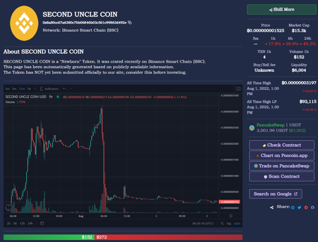 “二舅”这个标签,无疑是博眼球的“热点事件”。根据二舅币的发行者@second uncle dao公布的内容显示,SUC交易池创建于2022年7月27日,正是“二舅”讨论度达到顶峰的时间。发行总量10000亿枚,横向对比与其关联的、发行量为2亿枚的币安币(BNB),发行数量大的离谱,而每个二舅币的最高币值仅有0.00000003197美元。