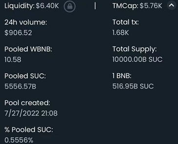 在后续动态中,作者表示,目前在池子中流通的币仅占总额不到0.6%,他个人/团队已不再持有任何SUC,而其余超过99%的币已被存入“黑洞地址”——存入一个无人知晓的钱包并毁掉秘钥,这部分SUC约等于被撕毁而消失了,仅有少部分仍能流通。