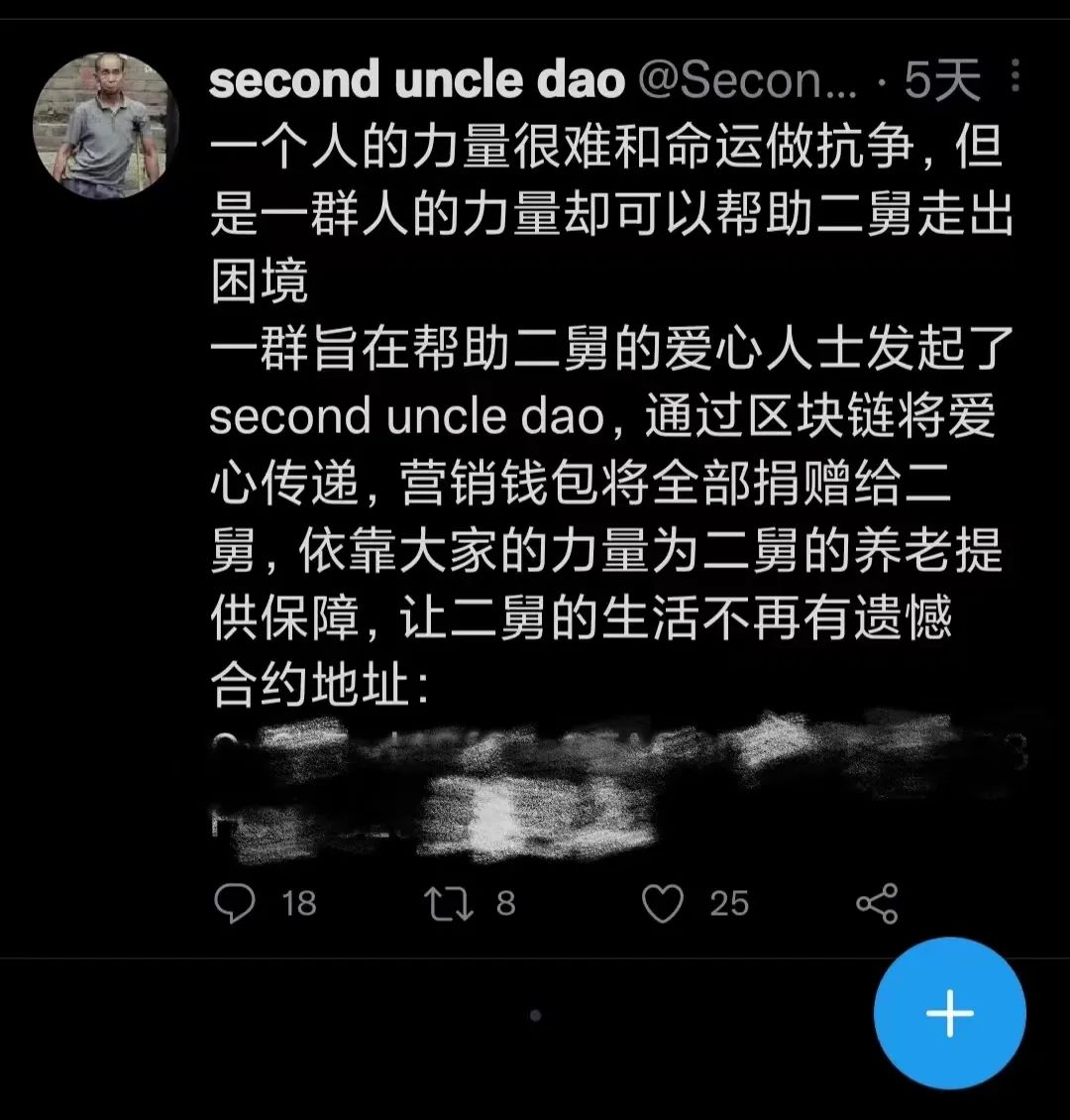 2022年7月28日,推特账号@second uncle dao发布消息称“一群旨在帮助二舅的爱心人士发起了二舅币(Second Uncle Dao,简称SUC),通过区块链将爱心传递”,并附上了合约地址,表示自己发行了名为“二舅币”的虚拟币,该项目的收益将“捐赠给二舅作为养老保障”。